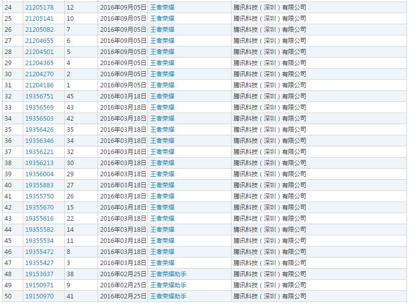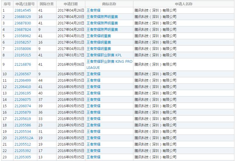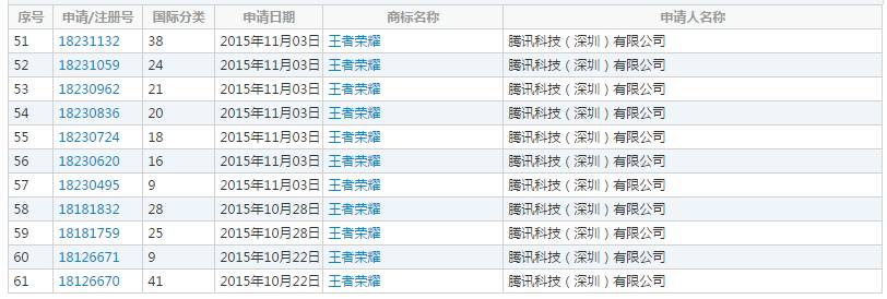 2015年10月到2016年9月,腾讯申请注册商标达56条,从职业赛事推广到多媒体宣发以及周边产品一应俱全,做到45类全面覆盖。